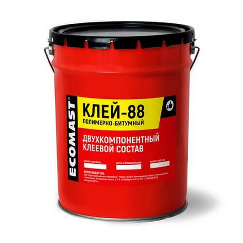 ECOMAST Клей 88 двухкомпонентный клеевой состав (адгезив) на основе битумно-полиольного связующего и изоцианатного отвердителя. Предназначен для склеивания деталей из пеностекла между собой и приклеивания к таким основаниям, как бетон, кирпич, сталь или алюминий. После отверждения слой адгезива остается высокоэластичным и подходит для поверхностей с повышенными коэффициентами линейного расширения.Подходит для эксплуатации во всех климатических зонах РФ, а также в агрессивной промышленной атмосфере химических и металлургических предприятий и портовых сооружений.